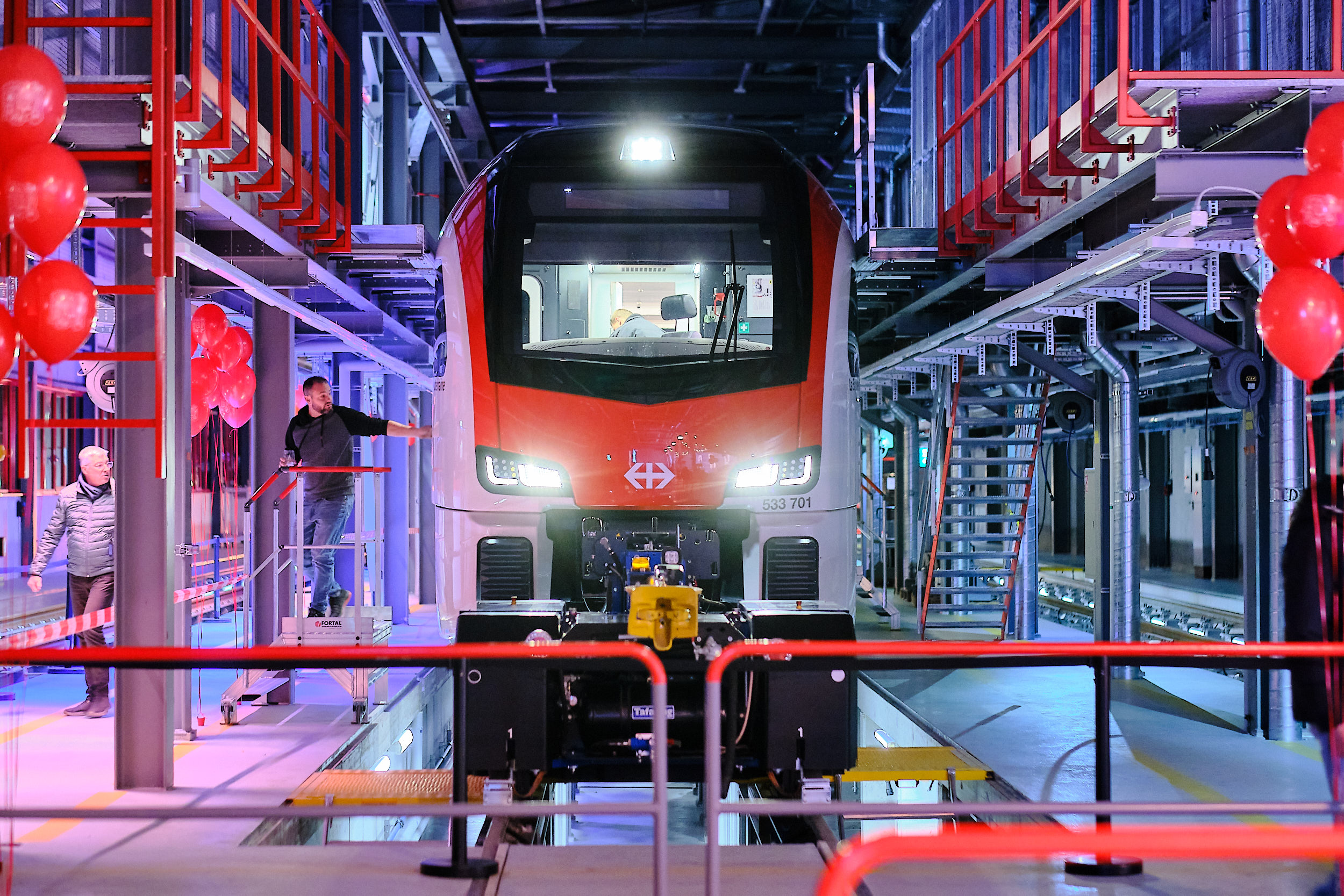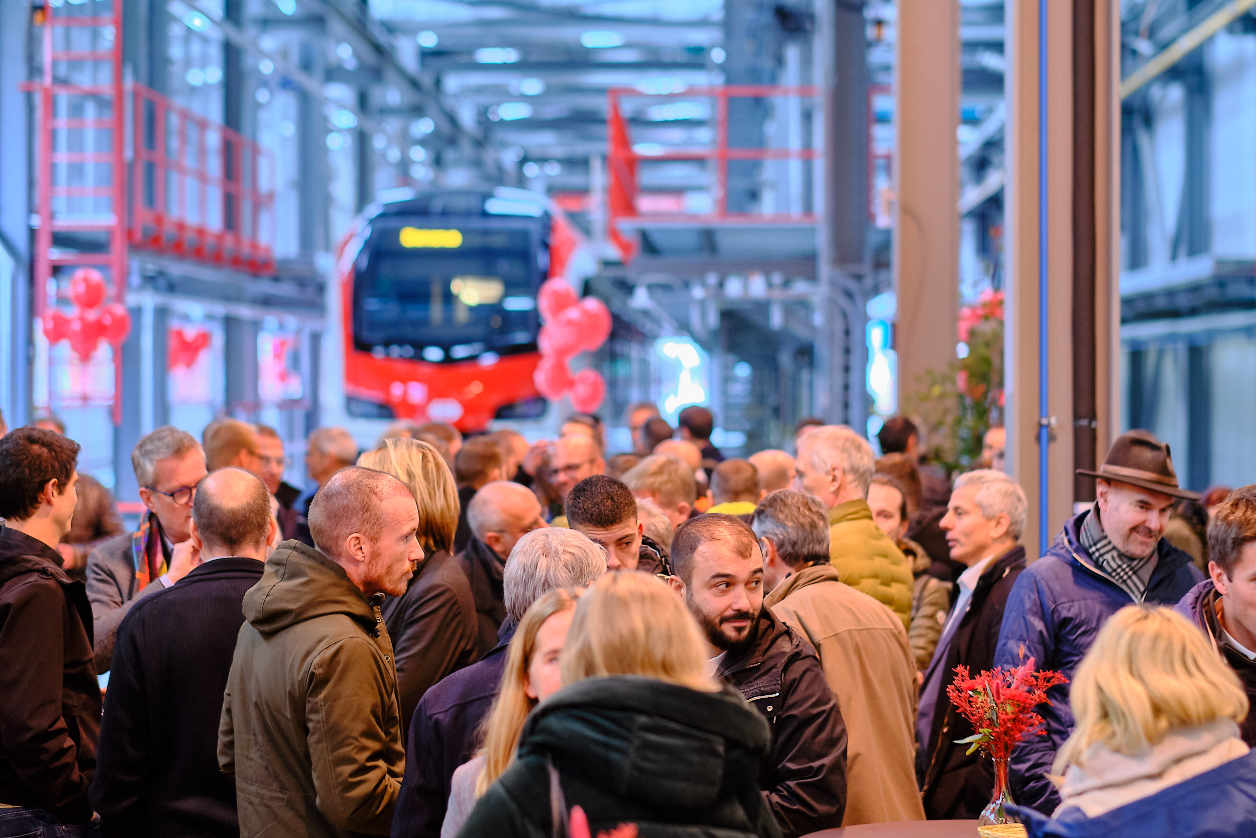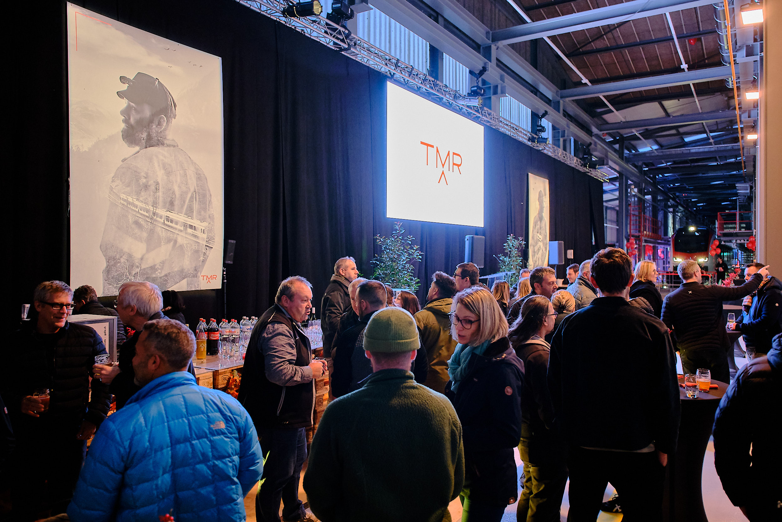 Les voies ferrées, éclairées aux couleurs de TMR, les fosses de maintenance, l’atelier de bogies et les outils ont été intégrés à la scénographie comme de véritables éléments narratifs. La dimension humaine a été renforcée par l’installation de grands portraits photographiques des collaborateurs ayant œuvré sur le chantier, découpés avec précision et ponctués de la signature rouge TMR.